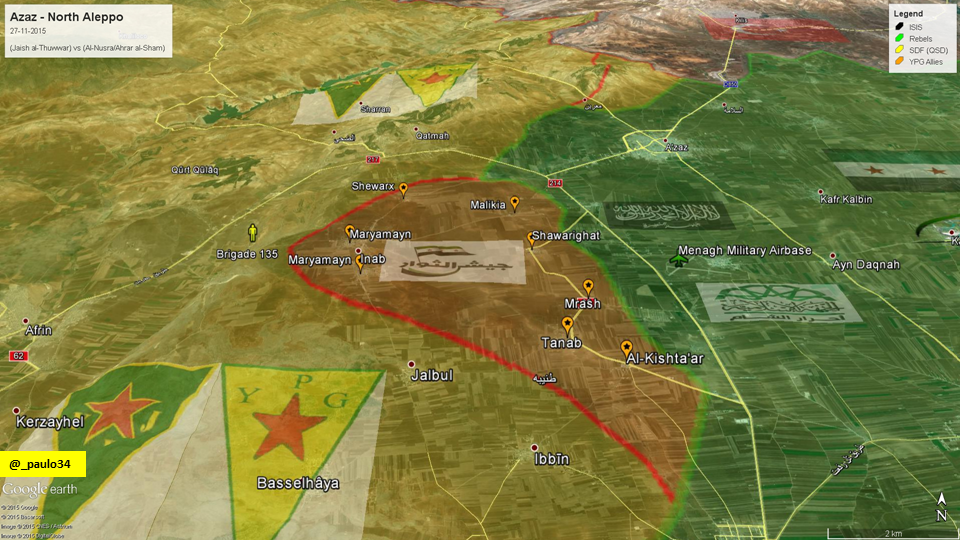 #SRO - Clashes still ongoing near the #Azaz-#Aleppo road as #YPG are reinforcing secular #FSA against the islamist #FSA and salafi forces.![]()