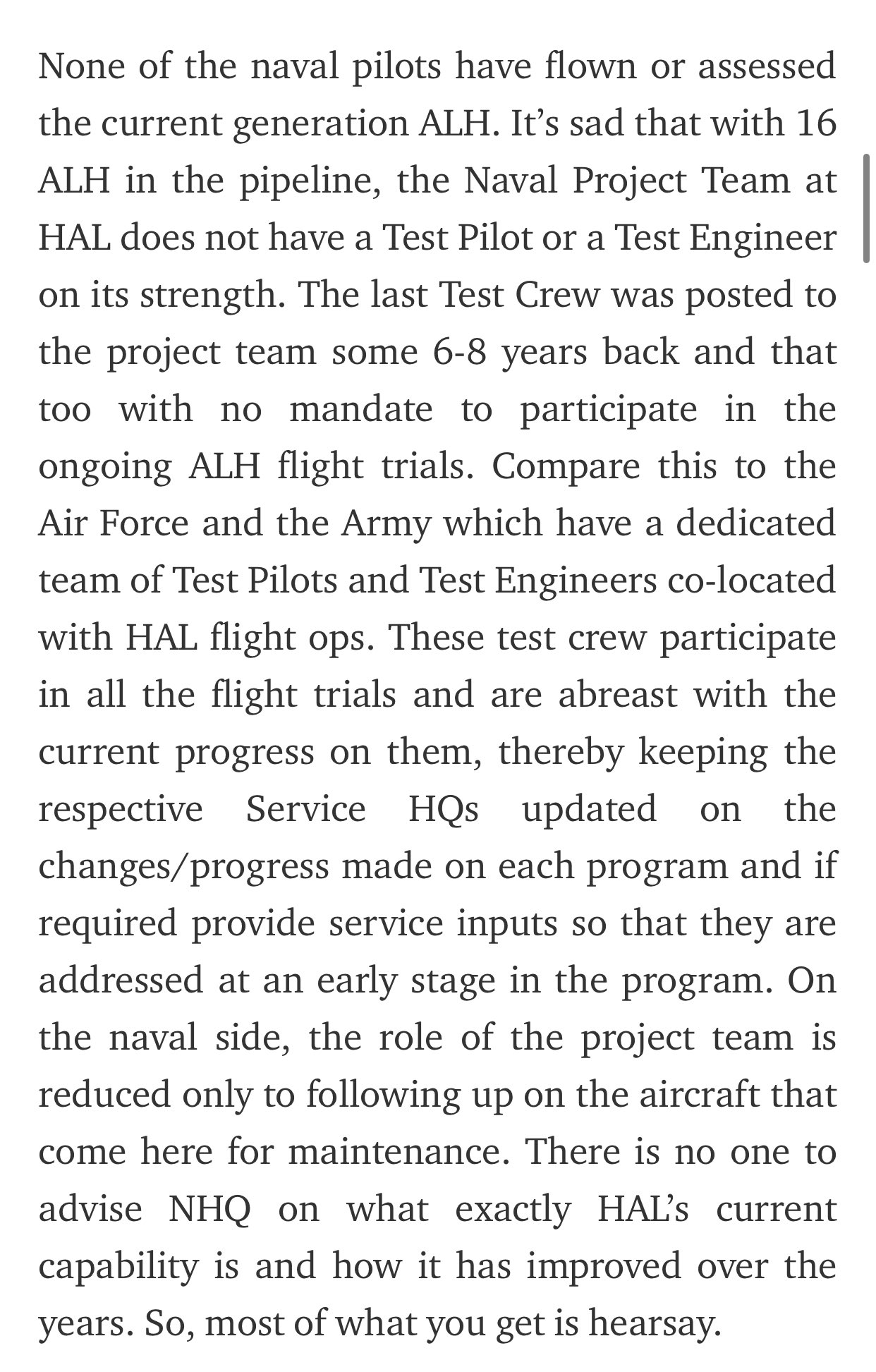 Jay wrote: This is painful to read. The article lays out the context of Navy's opposition to Dhruv and the working relationship it has with the supplier(HAL). The bureaucracy and the bone-headed logic that's seems to be ingrained in HAL is a site to behold, and absolutely pitiful. There is no reason to not privatize HAL as it seems to be the only answer to instill accountability at this point.