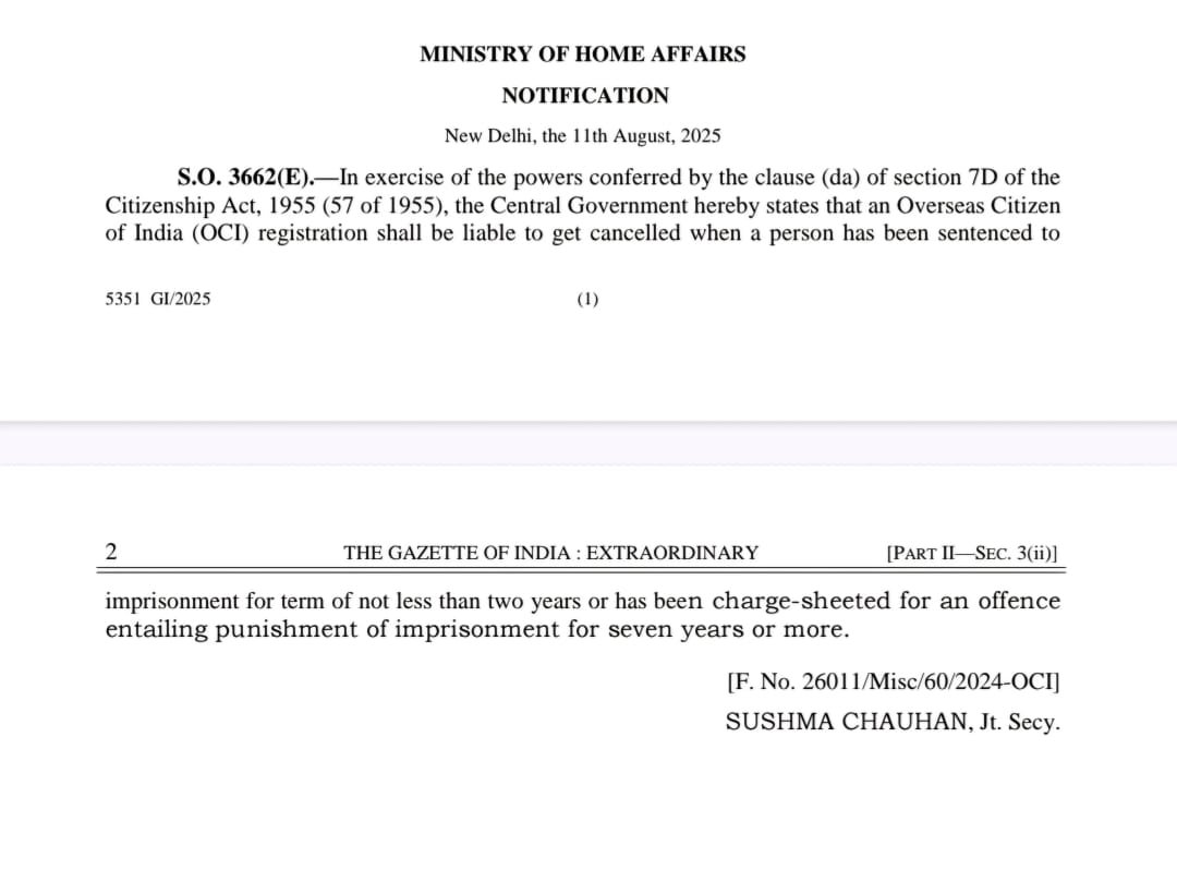 Meanwhile: OCI cards to be cancelled if-person has been sentenced to imprisonment of not less than 2 yrs