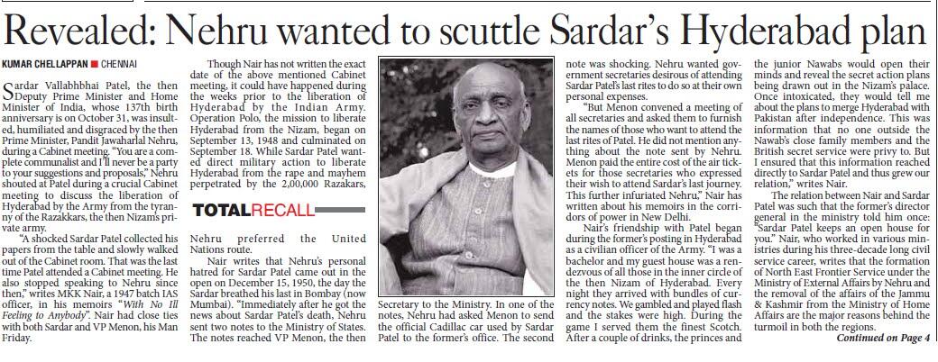 I think it was Modi who said this & I tweeted about this today:Karan M wrote:Thanks for the links. The first is eye opening. My relatives in Hyderabad well remember the days of the Razakars. A thanks to Patel as versus the great internationalist Nehru.